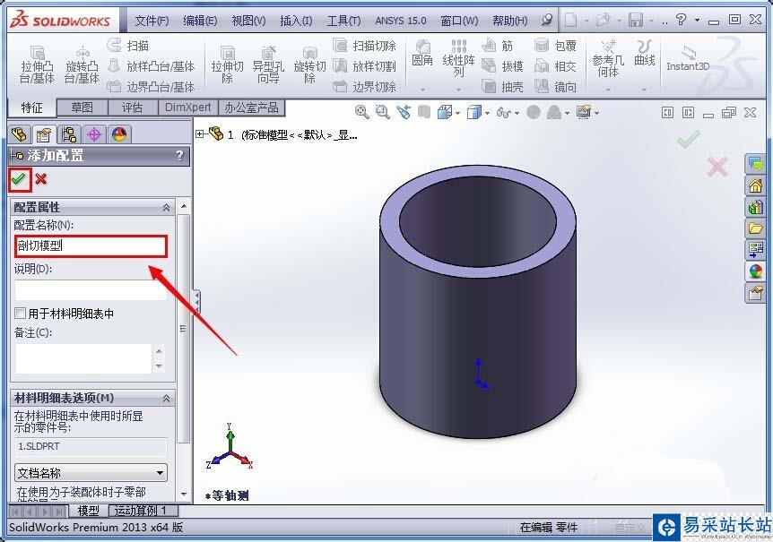 3、在配置欄空白的地方右鍵單擊,在彈出的對話框中左鍵單擊“添加配置”,輸入新配置的名稱(比如剖切模型)后點擊確定;