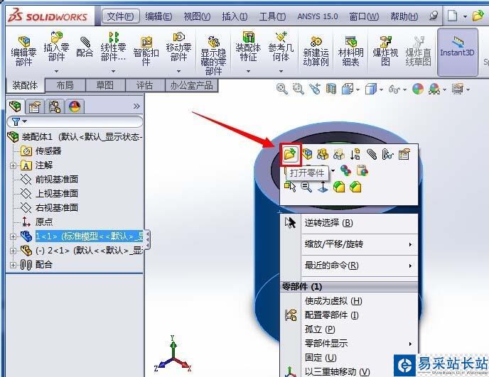 1、選中要剖切的零件并右鍵單擊,在彈出的對話框中左鍵單擊“打開零件”;