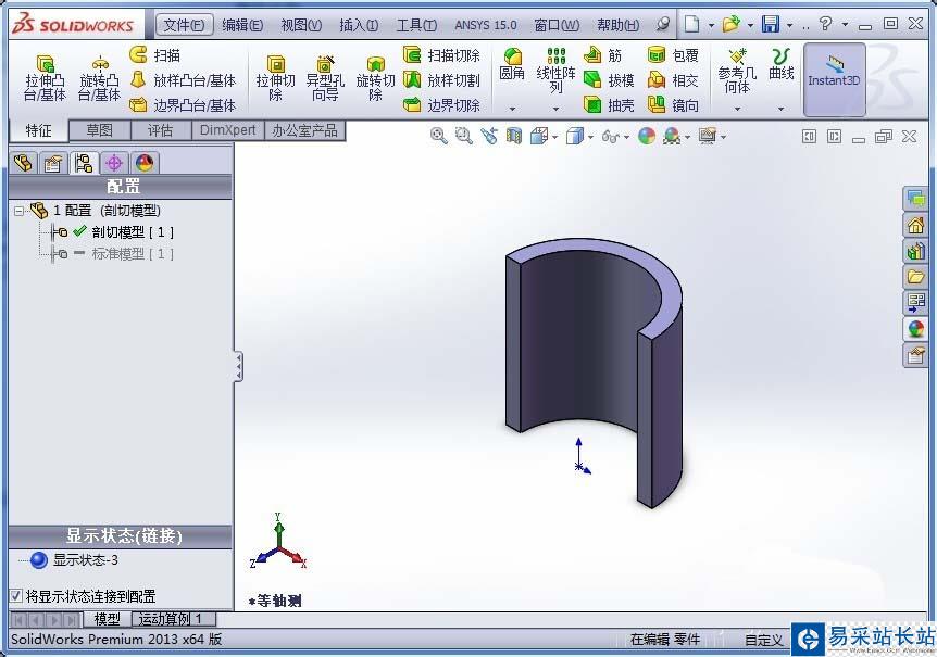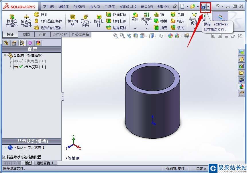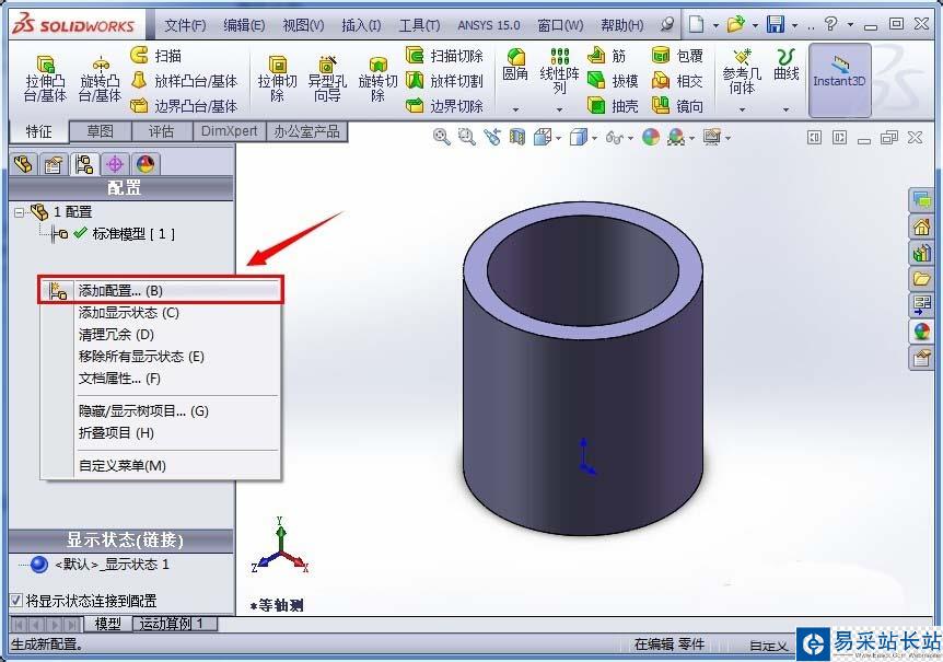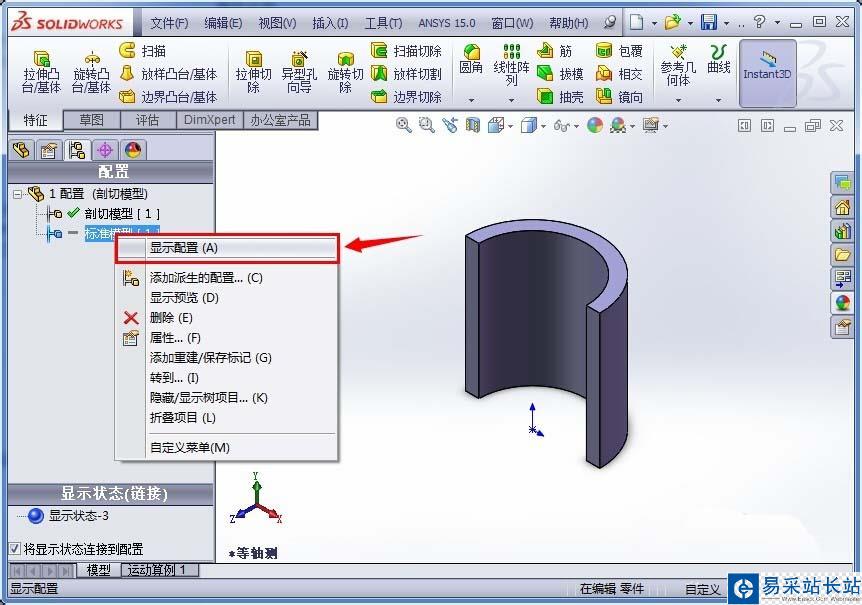 5、右鍵單擊“標準模型”,在彈出的對話框中左鍵單擊“顯示配置”,模型恢復到標準模型配置的顯示后保存剛剛的操作,然后關閉零件文檔;