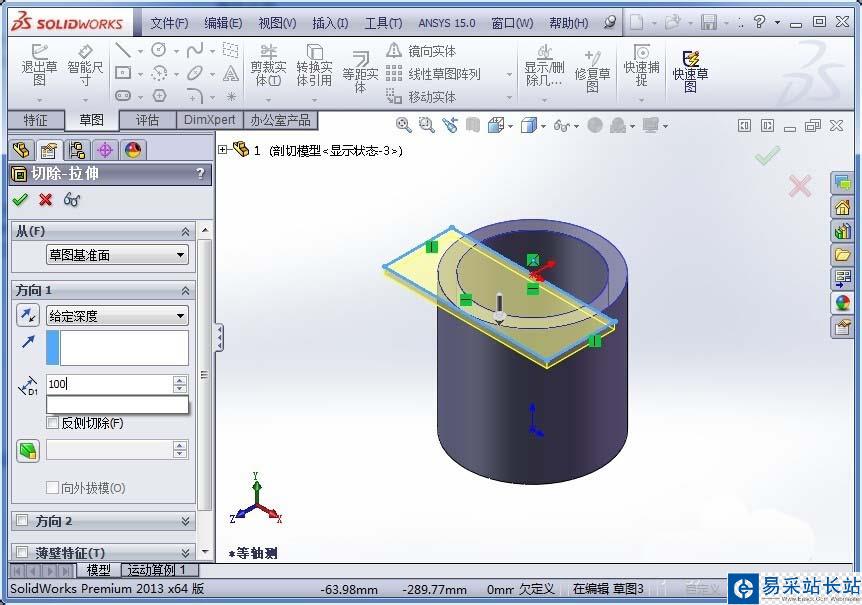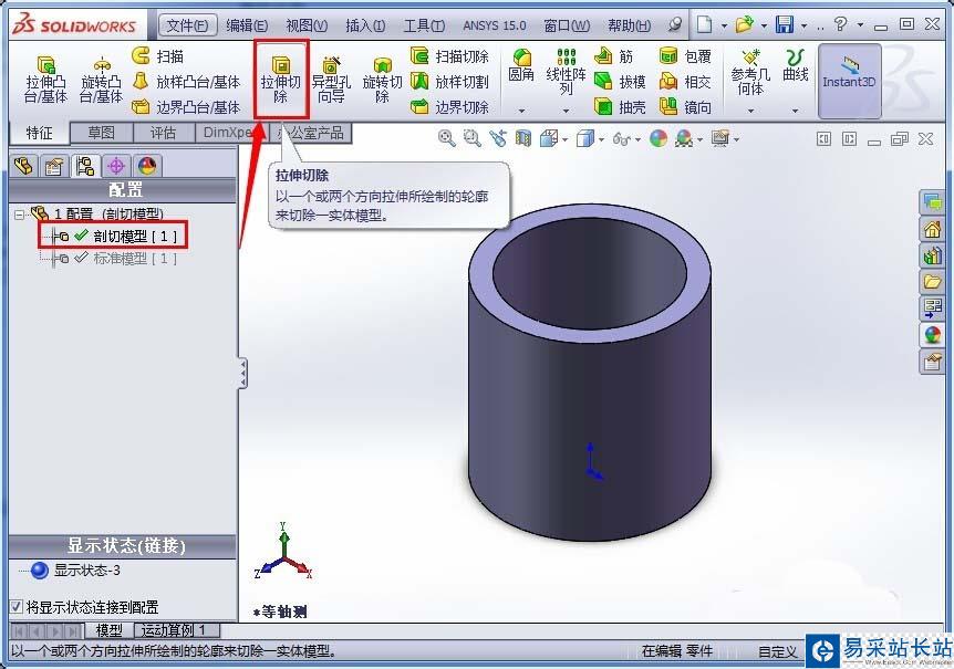 4、在新配置下,進行切除操作,根據自己的需要來確定切除的大小、形狀;