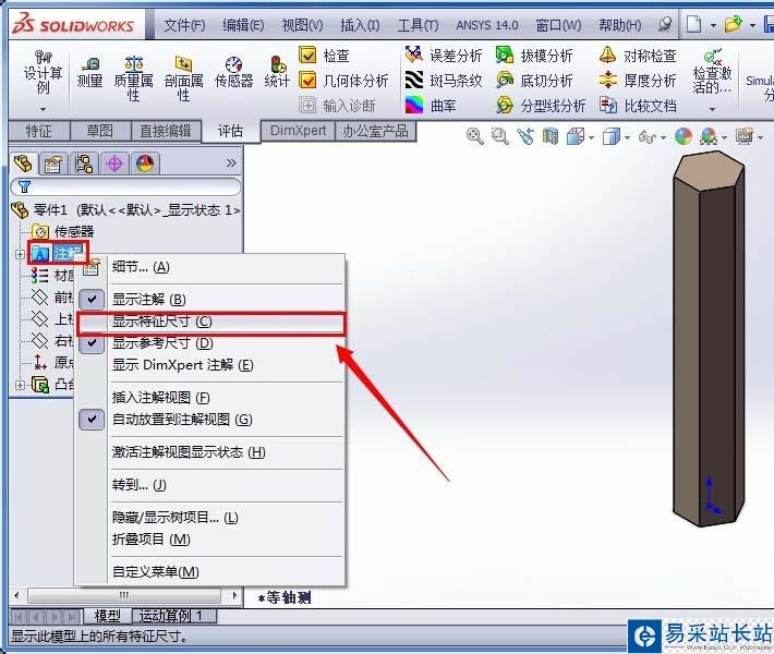 在零件環境中,右鍵單擊“注解”,在彈出的對話框中單擊“顯示特征尺寸”,則該零件所有特征的尺寸都顯示了。