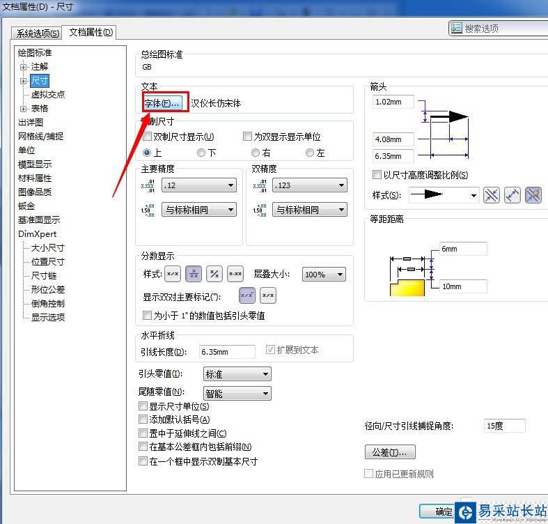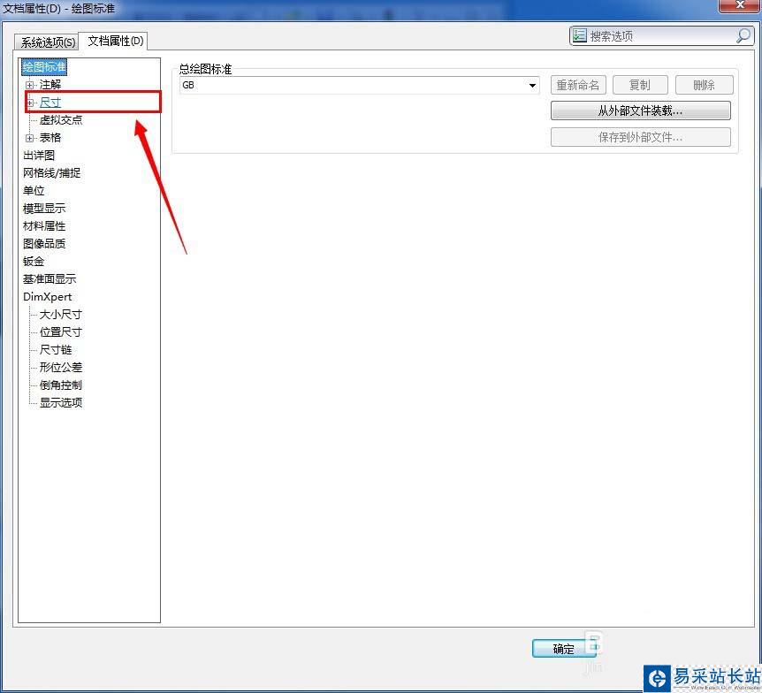 3、在“文檔屬性(D)-繪圖標準”對話框中點擊“尺寸”。