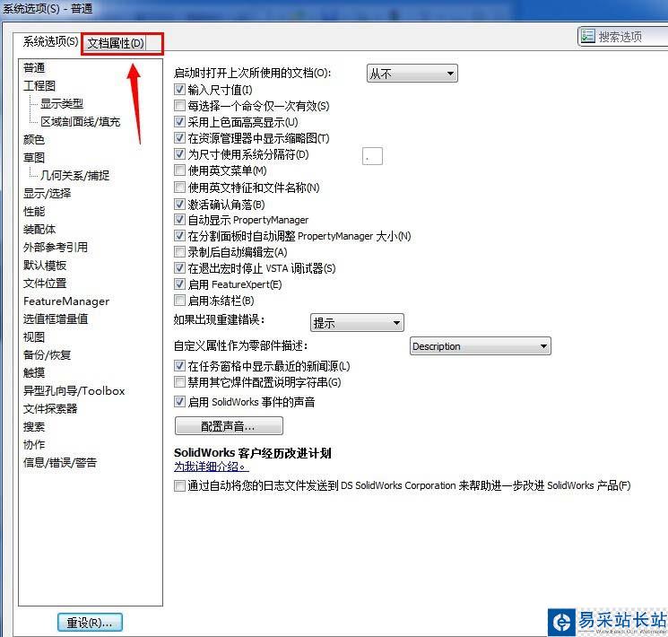 2、在彈出的“系統選項(S)-普通”對話框中點擊“文檔屬性”。