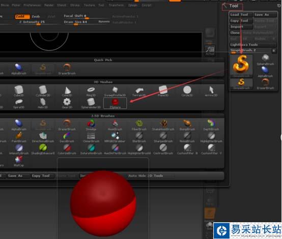 4、在Tool[工具]菜單中選擇ZSphere[Z球]工具,如圖所示。