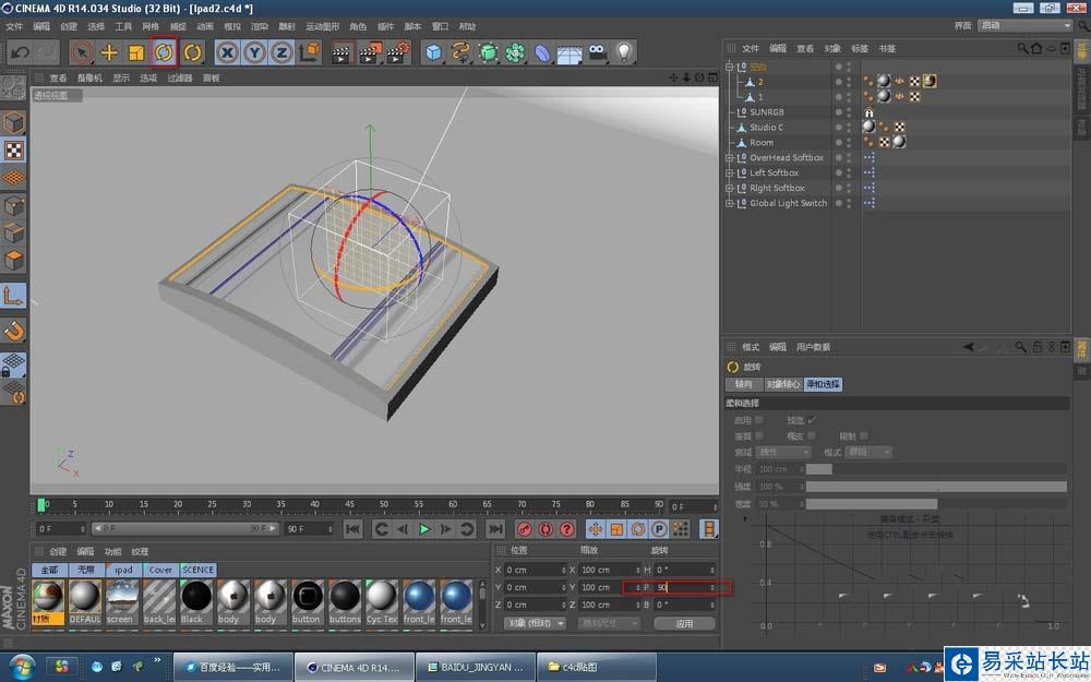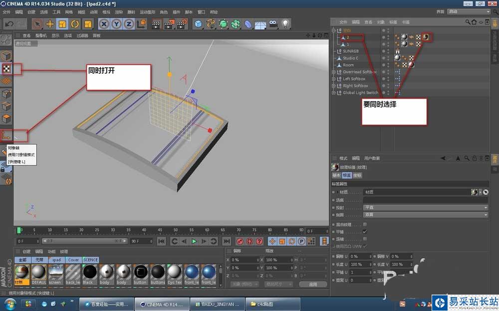 7、這步較為關(guān)鍵,需要同時(shí)選中模型和材質(zhì)球,然后在左邊的對話框里同時(shí)選擇“紋理模式”和“對象軸”。這樣的話就可以精確控制下面的旋轉(zhuǎn)角度。