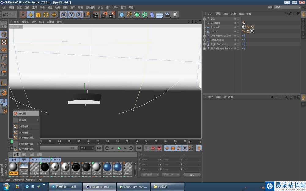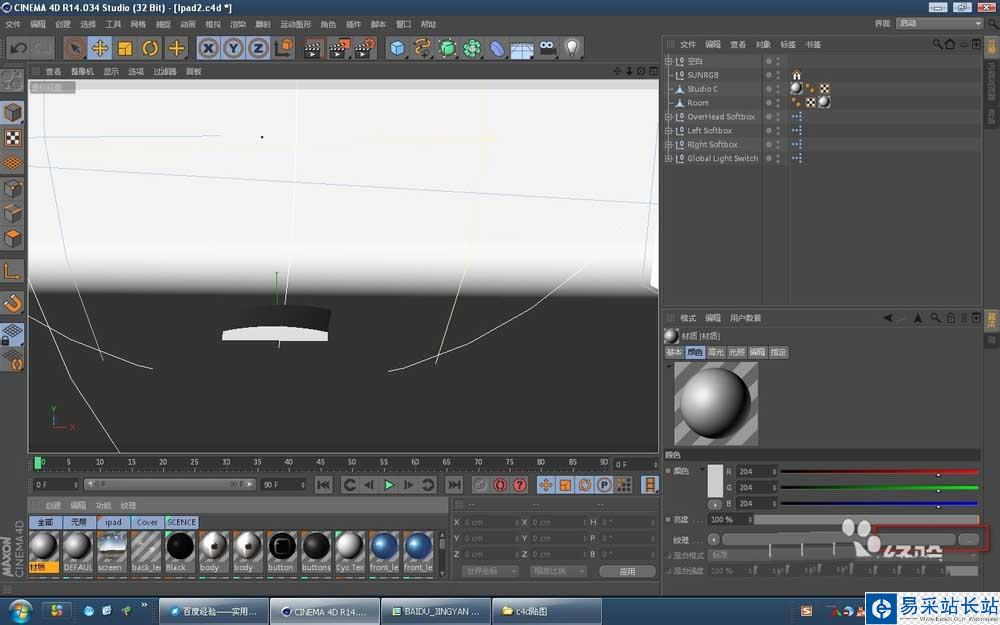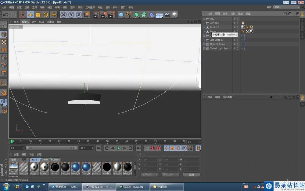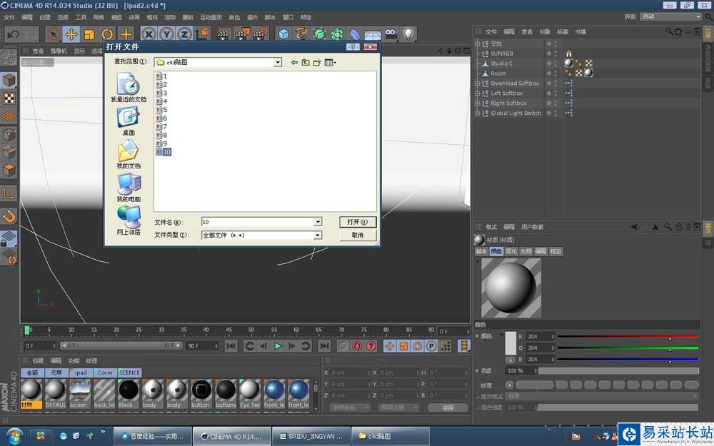 1、打開一個(gè)帶有燈光、場景及材質(zhì)球的c4d源文件。
