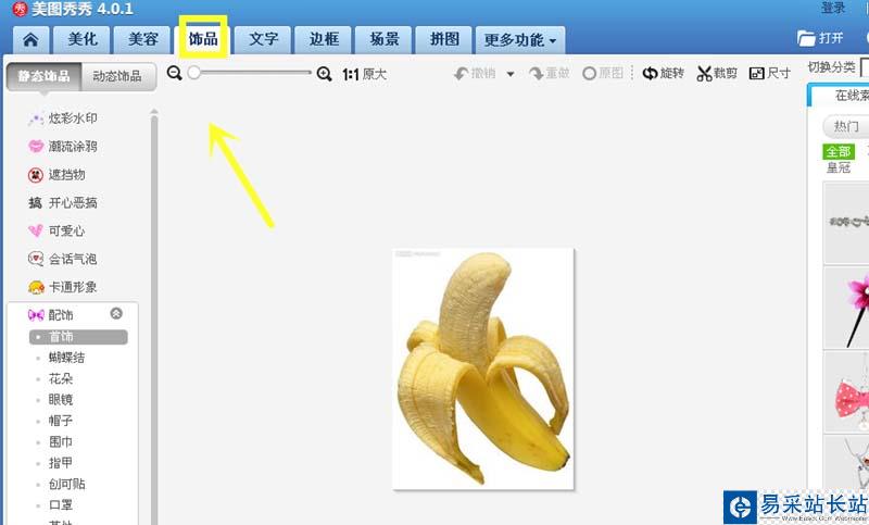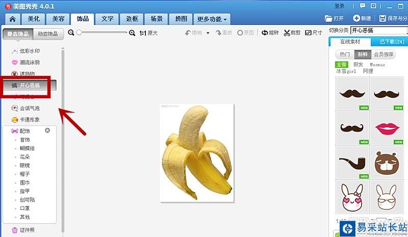 4、圖片打開后,選擇【飾品】中的【開心惡搞】對圖片進行裝飾。