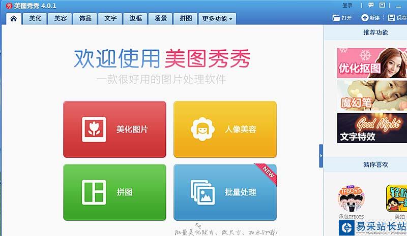 1、打開電腦,打開美圖秀秀軟件,進入美圖秀秀圖片處理軟件。在美圖秀秀操作頁面上,點擊“打開”。
