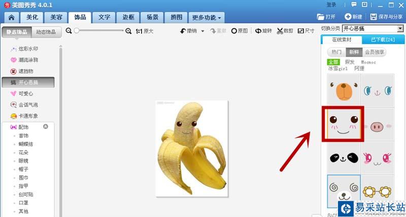 6、把可愛神態調到香蕉上,根據【素材編輯框】調節神態的大小和位置。萌萌噠”的香蕉圖片做好了,如圖。