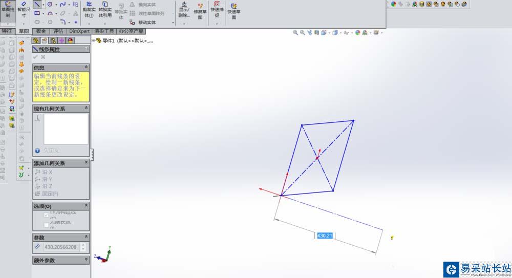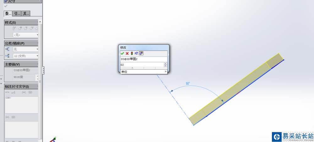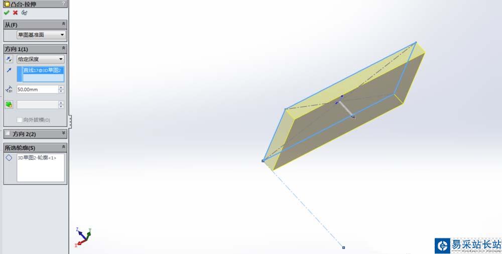 4、退出草圖,點擊拉伸凸臺,所選輪廓為矩形,方向為另一條構造線,此時的拉伸凸臺和2D草圖的拉伸凸臺是一樣的。隨后編輯草圖,捕捉到作為方向構造線的角度尺寸,均改為60°。
