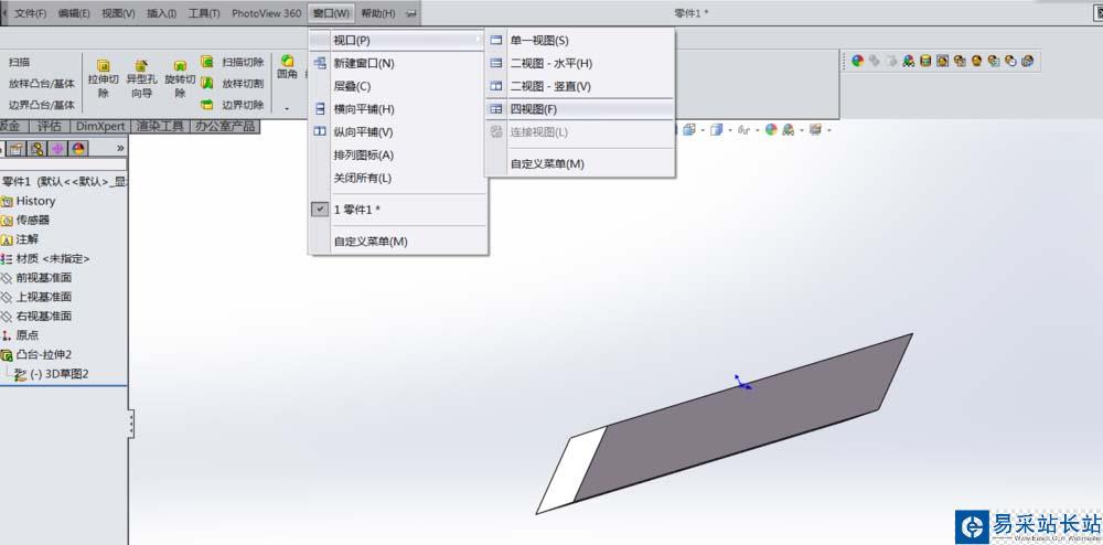 5、退出3D草圖,此為3D草圖下可以完成的凸臺。為了更直觀一些,小編點擊了窗口命令下的視口命令,然后選擇四視圖。