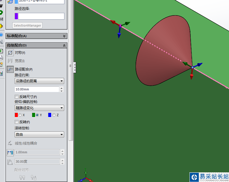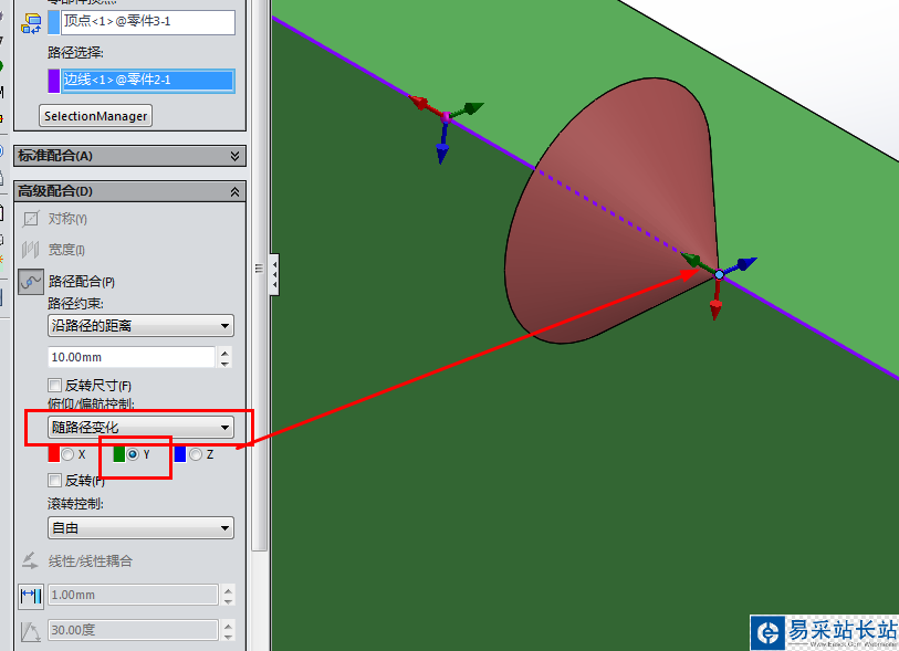 4、俯仰/偏航控制選擇。自由表示零部件不受約束。隨路徑變化表示將零部件的一個軸(可以選擇xyz)約束為與路徑相切。這里選擇隨路徑變化Y軸