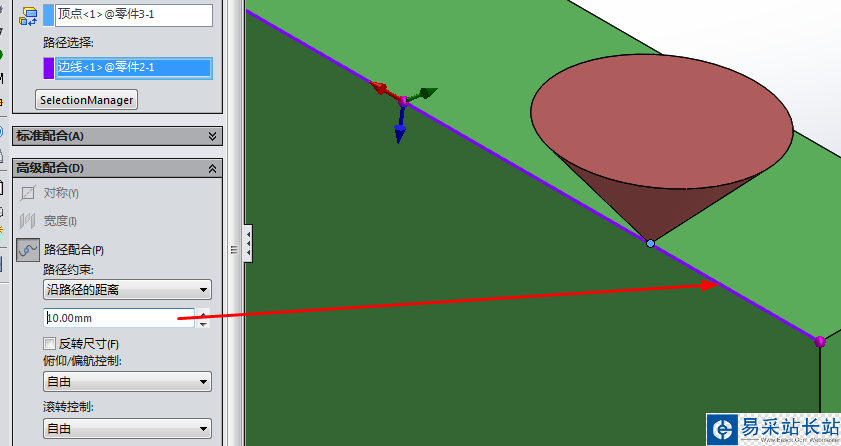 2、選擇圓錐面的頂點作為:零部件頂點,選擇矩形塊的一條邊為路徑