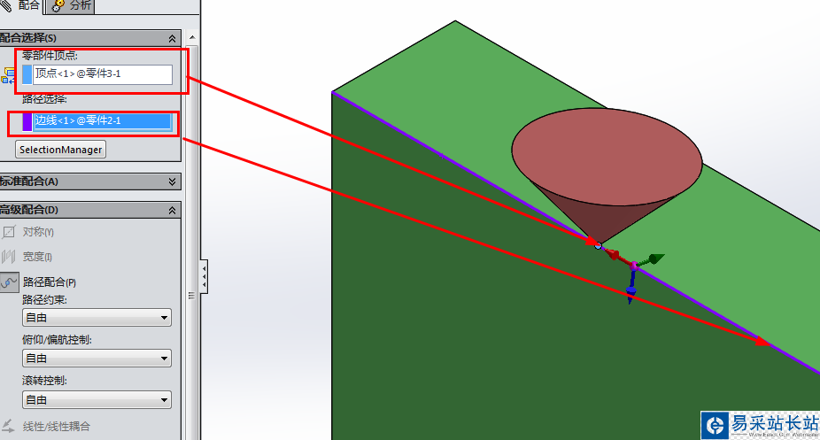 solidworks路徑配合可以使頂點繞著規定的路徑運動,路徑配合的要素:1.零件頂點2.一條路徑,直線,曲線。
