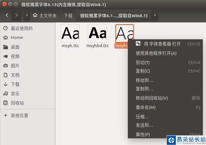 此時就需要找度娘要字體了,一般情況下,還是使用微軟雅黑細體比較好,當然也可以使用其他字體,上面提供下載,下載好字體之后,解壓,把字體復制到Home目錄,因為顯示中文是框框,所以放Home目錄可以防止找不到文件夾的情況發生。