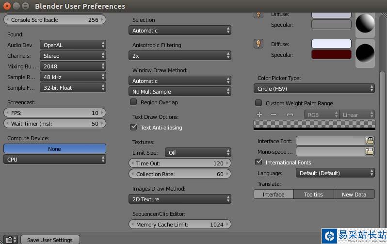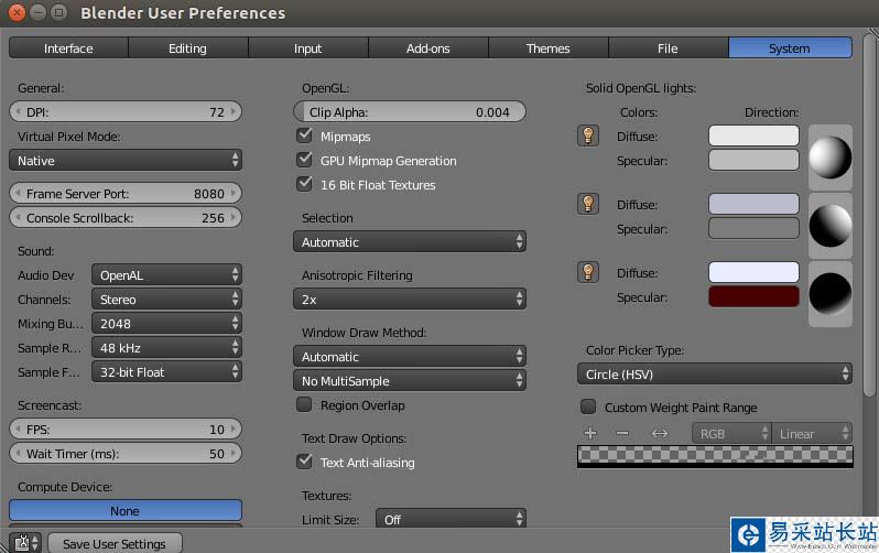 打開Blender,點擊左上角的File,點擊User Preferences然后點擊右上角的System選項,進入系統設置