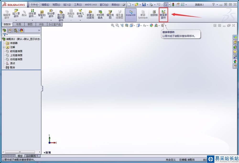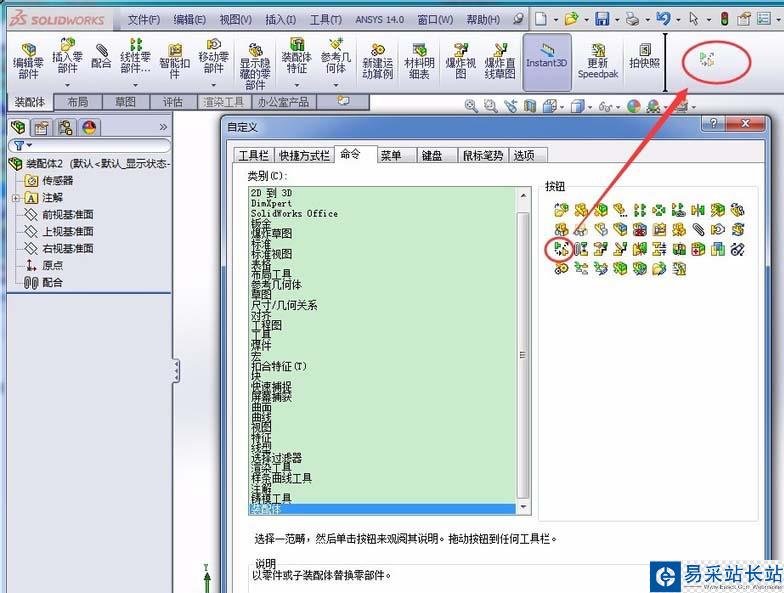 4、在“裝配體”的“按鈕”集中找到“零部件替換”,直接將之拖到圖示的空白區(qū)域,則創(chuàng)建了一個“替換零部件”快捷按鈕