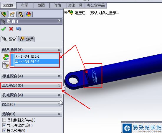 3、選擇液壓缸桿的地面與液壓缸缸筒內(nèi)徑的地面作為要設(shè)置的約束面。