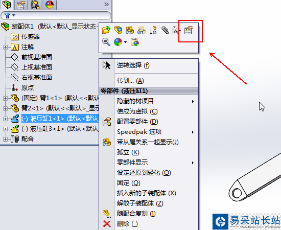 9、接下來是保證油缸在裝配體中可以運(yùn)作的重要一部。點(diǎn)擊零部件屬性按鈕,彈出對(duì)話框。