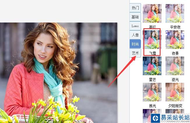 6、點擊時尚選項,在其內找到飛雪選項,如圖所示: