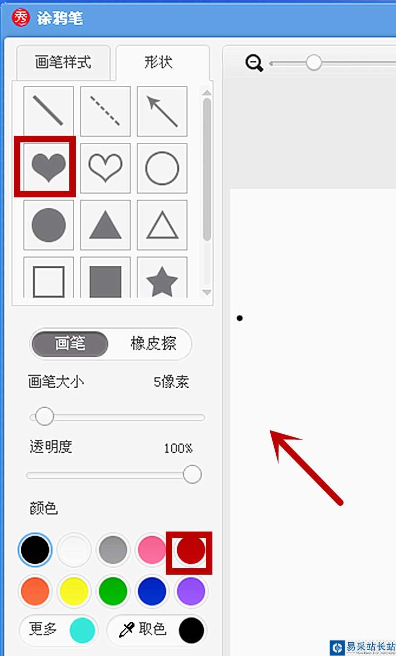 6、出現【涂鴉筆】框,在【涂鴉筆】框中選擇【形狀】。在【形狀】中點擊心形,在顏色中選擇紅色。