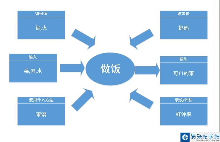 4、繼續繪制頭部,找到TQM圖中的”兩部分職能”,在上半部分填寫”輸入”下半部分輸入”菜,肉,油….”(根據實際情況填寫)