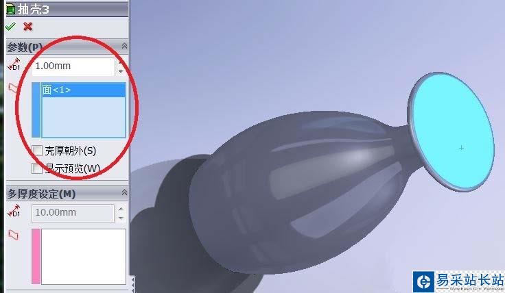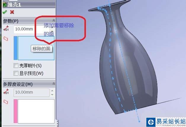 5、彈出抽殼命令對(duì)話框,選中需要移除的面