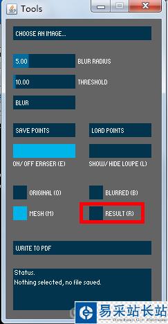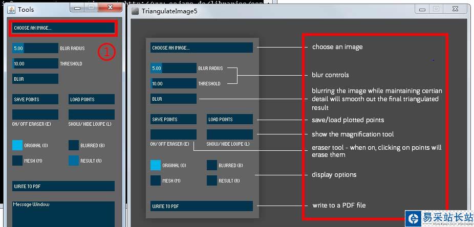 3、出現這個界面,下圖中的①:choose image,是"選擇打開圖片按鈕",左邊是操作按鈕,右邊是顯示界面
