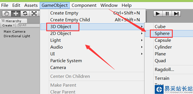 3、點擊gameobject菜單在其子級菜單里找到3d object選項,點擊該選項在其下拉菜單里找到sphere選項,如圖所示: