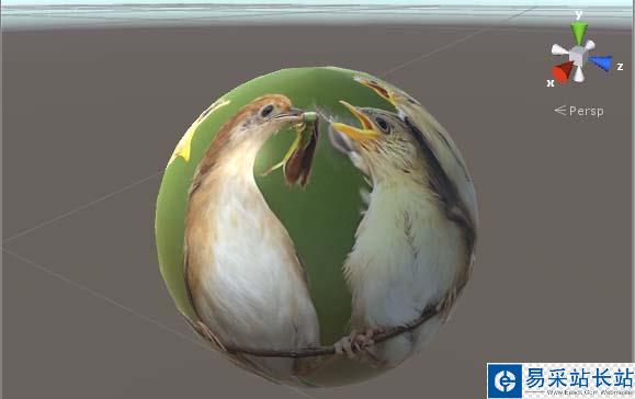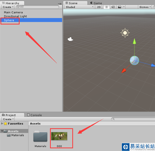 5、在assets內找到一張材質圖,使用鼠標左鍵將其拖拽到剛剛創建的sphere物體上,如圖所示: