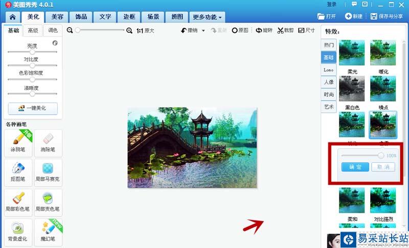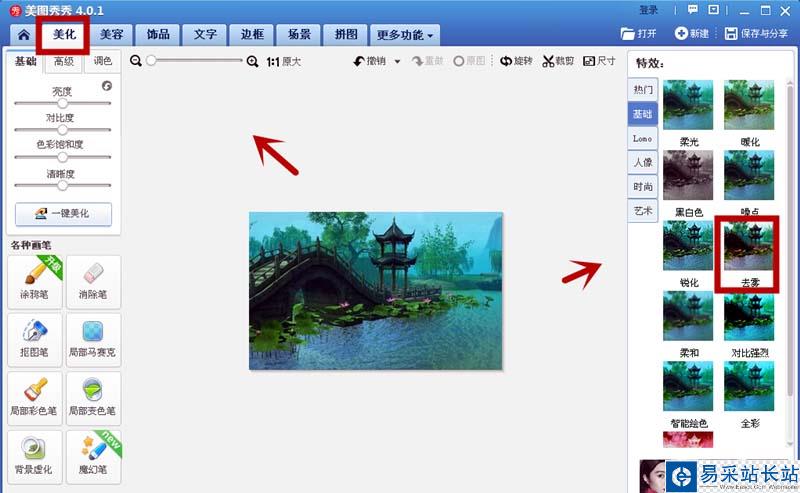 4、打開圖片后,在單擊美化。在右邊的特效下的基礎中找到去霧。