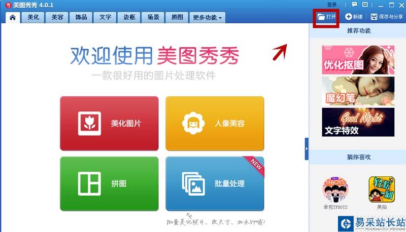 3、在美圖秀秀軟件中出現打開一張圖圖框,在這個圖框中找到圖片名稱,單擊打開。