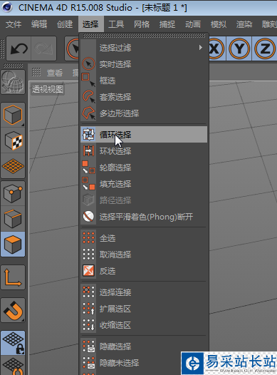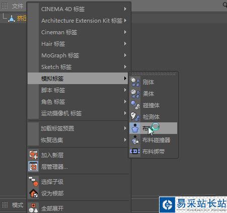4、接下來要給模型添加布料動力學,右鍵單擊模型圖層,選擇動力學子菜單下的布料命令,切換到面編輯模式下,單擊選擇菜單,在彈出的下拉列表中選擇循環選擇命令,然后選擇模型的側面