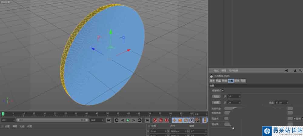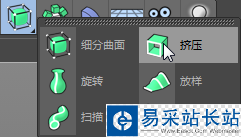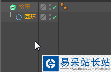 2、打開細分曲面工具組,在彈出的窗口中選擇擠壓命令,將剛才建立的樣條拖動到擠壓圖層下面,使圓形樣條生成厚度,選中擠壓圖層,在屬性面板中將移動屬性第三個數值更改為200