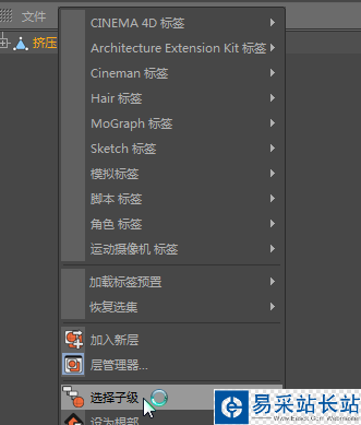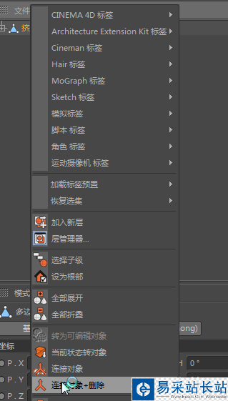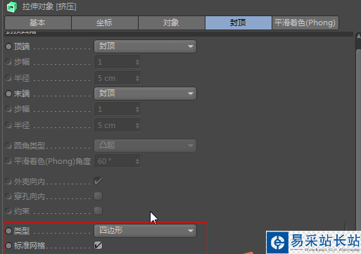 3、選中擠壓圖層,在屬性面板切換到封頂選項卡中,將類型更改為四邊形,并且勾選標準網格選項,然后敲擊鍵盤上的字母C鍵將當前模型轉換為可編輯對象,右鍵單擊當前圖層點擊選擇子集命令,然后再次右鍵單擊,在彈出的菜單中選擇連接對象加刪除命令