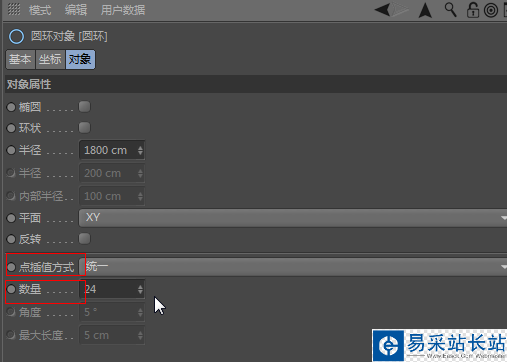 1、首先啟動軟件,單擊自由樣條工具組,在工具組內選擇圓形樣條,此時新建成功一個圓形樣條,在屬性欄將半徑更改為1800cm,將點值方式設置為統一,數量更改為24