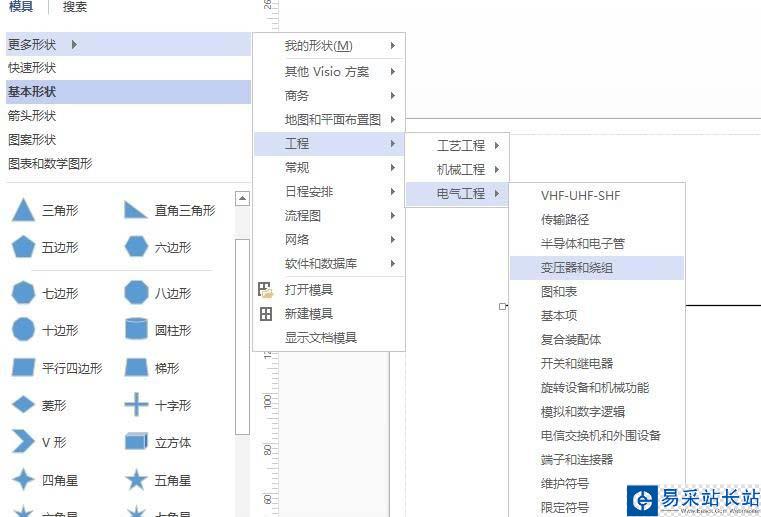 2、我們先隨便建立一個新文件。需要什么就在庫里添加。在左側更多形狀,工程,電氣工程里勾選電氣工程形狀。里面有一些元件可以直接拿來用。