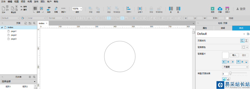 1、雙擊打開Axure RP 8設(shè)計軟件,在基本元件中找到“橢圓形”,拖曳一個到畫布上,如下圖所示: