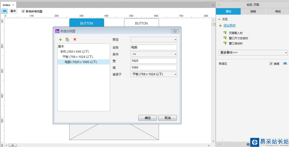 5、點擊左側(cè)自適應(yīng)按鈕,彈出自適應(yīng)視圖,分別設(shè)置手機、平板和電腦分辨率的范圍,如下圖所示: