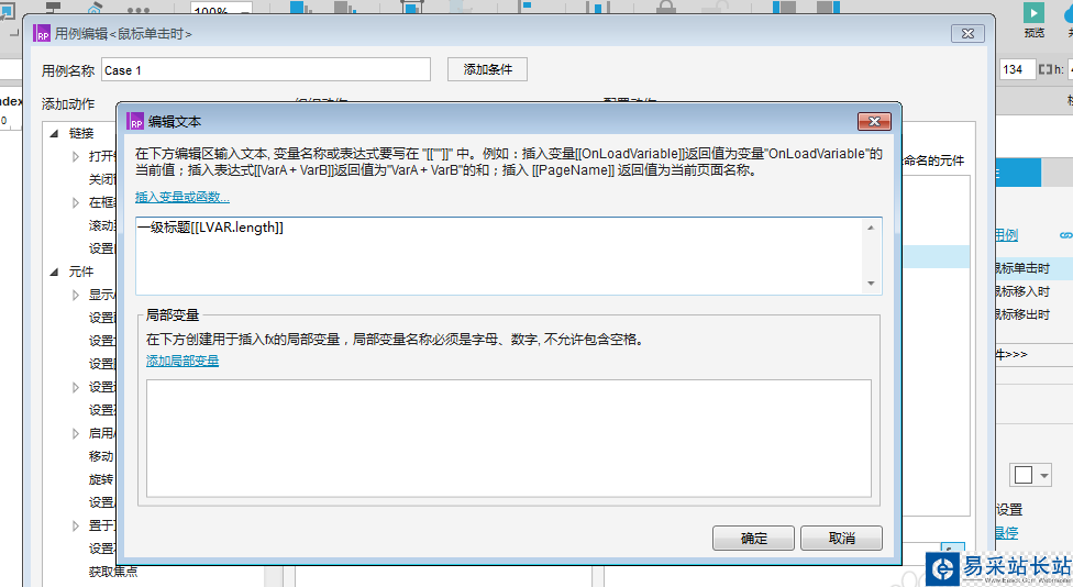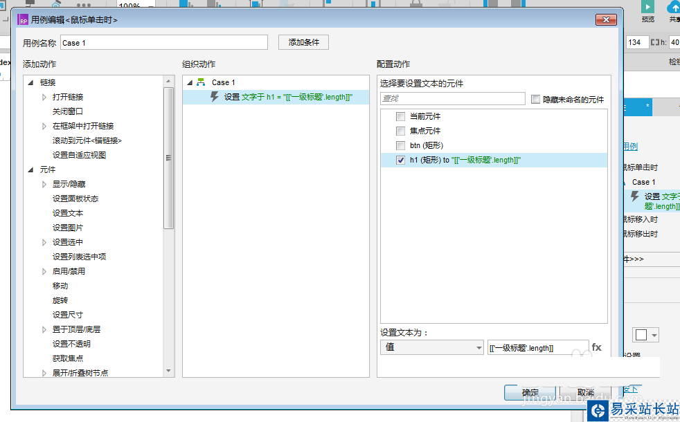 4、選中“設置文本”,選中“h1”矩形,點擊“fx”添加獲取字符串長度的方法,如下圖所示: