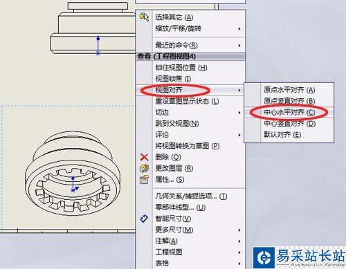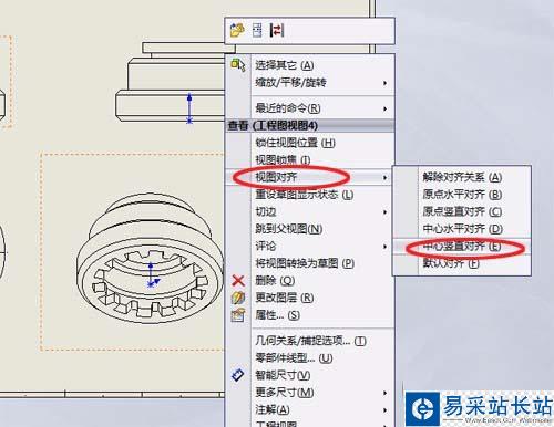 4、再在中間的工程圖視圖中選擇三維圖,右鍵單擊,在彈出的下拉菜單中選擇“視圖對齊”選項,再單擊選擇“中心豎直對齊”選項,如下圖