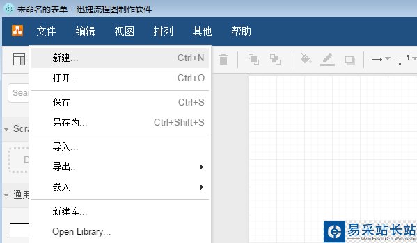 2、點擊軟件界面上的“文件——新建”,新建一個編輯頁面。若是要在其他的流程圖上進行編輯,也可選擇“文件——打開”。