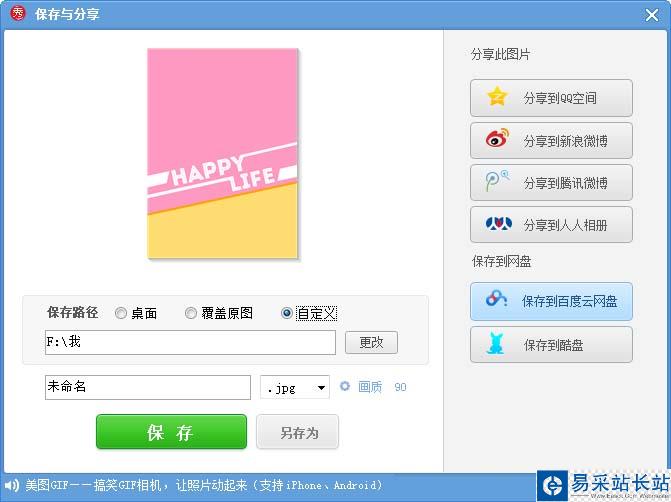 6、拼圖完成后,我們點擊保存和分享,在對話框里面,我們還可以選擇分享社交網站和上傳在網盤中,極大的方便用戶。