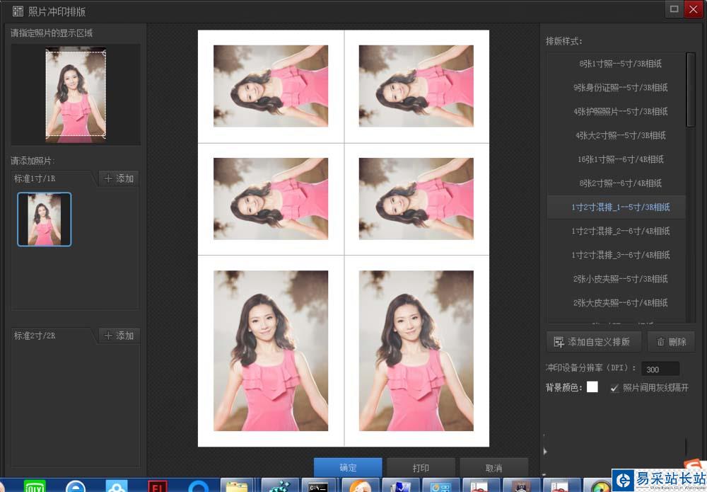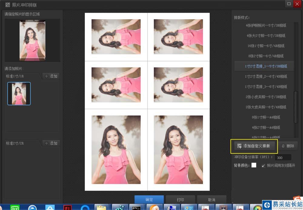 5、在自定義排版對話框中,我們需要選擇相紙的規格和照片的規格,然后調節距離和排數,就可以設置好一個排版樣式了。我們可以預覽一下樣式。