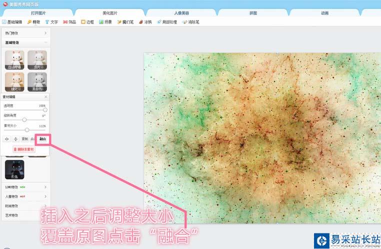 5、插入之后調(diào)整大小,覆蓋原圖點(diǎn)擊“融合”