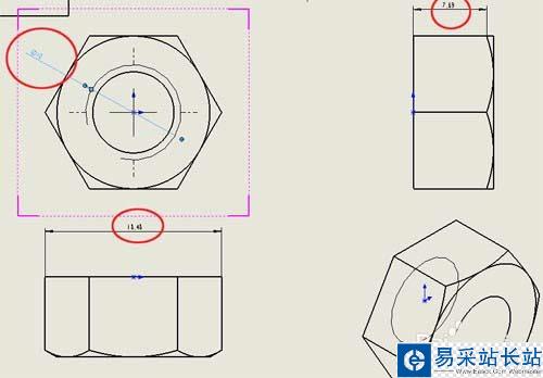 4、在工具欄中選擇“智能尺寸”按鈕,依次在三視圖中標注螺栓尺寸,如下圖
