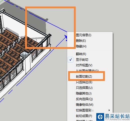 6、然后,關(guān)鍵的一步來了。切割完成后,點擊空格,讓鼠標變回黑色鼠標狀態(tài)。點擊剖切框直到其變?yōu)樗{色。然后再剖切框上右鍵 - 選擇剖面切割(其實就是其自帶的佐羅刀),ps.如果右鍵沒反應(yīng)的,重復(fù)以上步驟。注意一定要在藍色框上右鍵,在模型上右鍵出來的菜單是不一樣的。