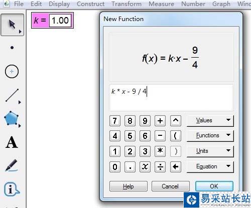 2、輸入函數解析式。鼠標單擊上方菜單欄“繪圖”菜單,在其下拉選項選擇“繪制新函數”命令,這樣就打開的新建函數對話框,左鍵單擊剛才建立的參數k,再依次輸入*、x、-、9、÷、4,如下圖所示。