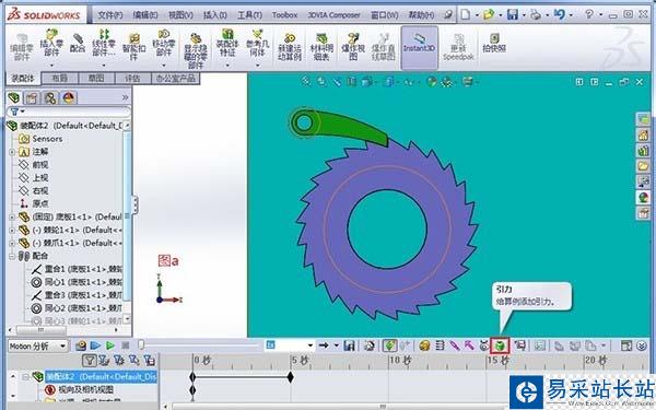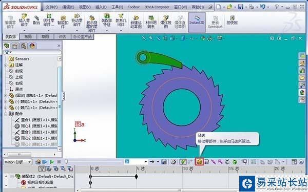 4、點擊如下圖a所示的電機圖標,在棘輪上放置一個旋轉馬達;如下圖b所示,旋轉馬達放置在棘輪上并且按順時針方向旋轉,轉速最好設置得小一點。
