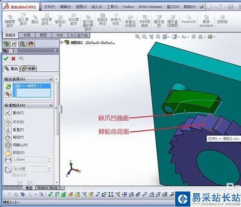 3、如下圖所示,選擇棘爪凹曲面和棘輪齒背面作為要配合的實體,系統自動將二者的配合關系選擇為“同心”。這一步保證棘輪棘爪之間有個合適的初始相對位置。此時所有零件都處于完全定位狀態。